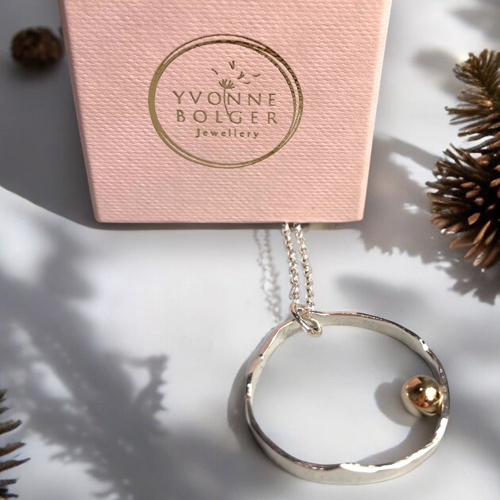 Sterling Silver circular section is 2.5cm approx in diameter with a 9ct Gold Bead. Sterling Silver 18in chain as standard.
